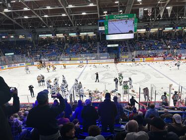 The return of the Sudbury Wolves' Teddy Bear Toss at the Sudbury Community Arena on Dec. 12, 2025. The 1,207 toys were donated to local charities for distribution over the Holidays.
