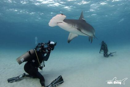 Underwater photographer Shane Gross photographs the endangered great hammerhead shark in The Bahamas. Photo by Vincent Canabal of Epic Diving. (Photo courtesy: Shane Gross)